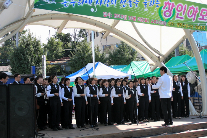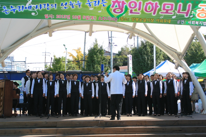 2013년 창인하모니합창단이 양평전통시장에서 공연을 가졌습니다. 사회복지법인창인원의 남여노소 50명의 직원으로 구성된 창인하모니합창단은 주1회 짬짬히 시간을 내어 합창연습을 하면서 이번 공연을 준비하였습니다. 가요메들리와 동요, 팝송 등을 합창곡으로 감미로운 선율을 들려주었습니다. 이경학단장님을 중심으로 이용근 상임이사님, 각 시설의 원장, 국장, 과장, 대리, 특수교사, 생활교사, 물리치료사, 간호사 등 각 분야의 사회복지전문가들이 한데 어우러져 아름다운 하모니를 통해 온누리에 사랑과 조화로움을 전하였습니다.