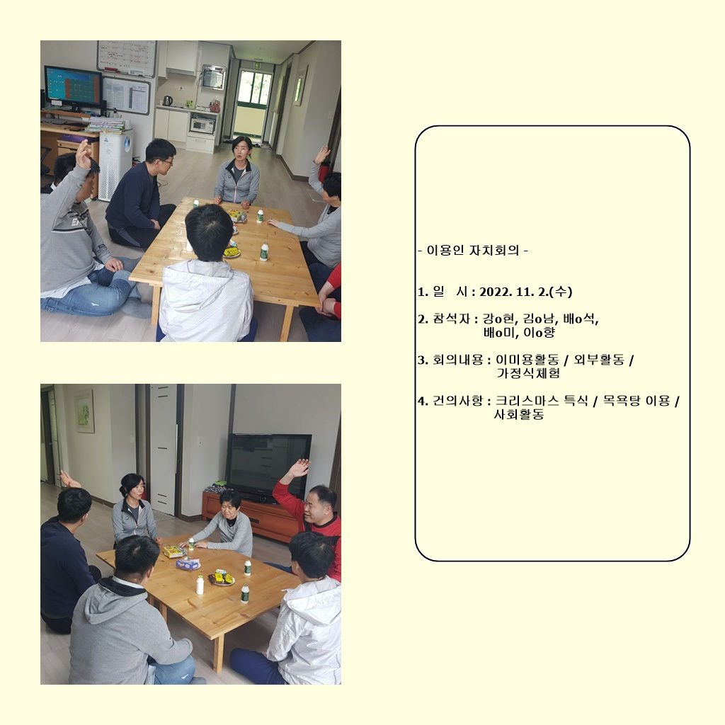 입소자 회의 페이지 정보 작성자 창인원 댓글 0건 조회 1,130회 작성일 22-12-30 13:04 목록 본문 11월 ~ 12월 사회적응 훈련, 가정체험활동, 이미용, 대중목욕탕등 회의내용 및 건의사항에 대해 진행하였습니다. 이전글1월 설(명절) 프로그램 23.01.31 다음글12월 프로그램 활동 22.12.30