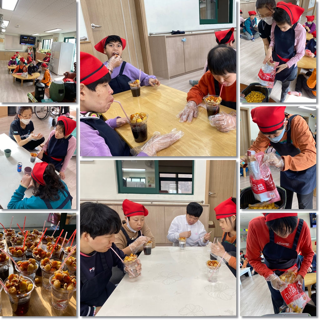 생활재활 선생님분들이 에어후라이기를 가져오셔서 이용인들과 함께 콜팝을 만들어 먹었어요.