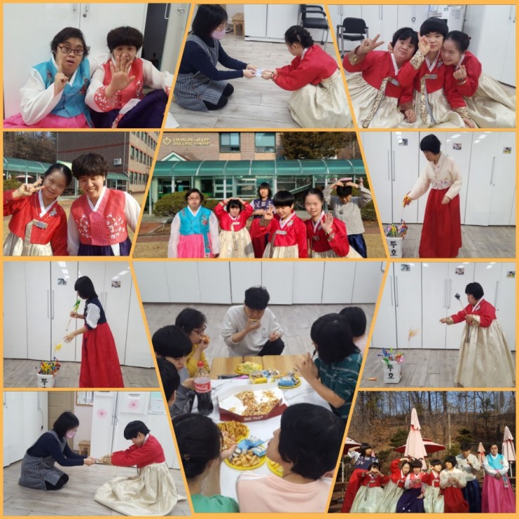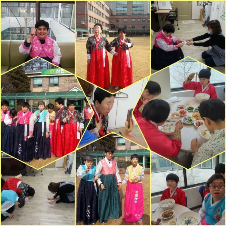 창인재활원 늘해랑실 이용인들이 2021 '설'을 맞이하여 맛있는 음식을 먹고 한복을 입어 보았으며