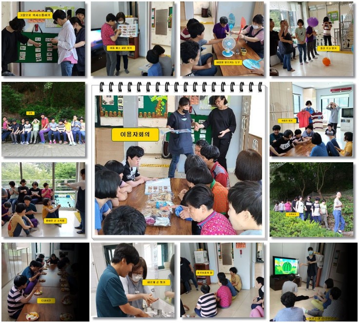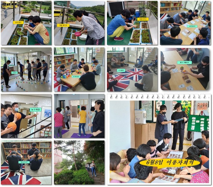 이용자회의, 그림으로 의사소통하기, 여름음식에 대해 알아보기, 6.25에 대하여,,, 6.25관련 영화시청, 운동영역(산책, 요가, 공주고 받기,  새천년체조, 스트레칭, 공놀이, 등...)감염예방교육, 여름중"사계:음악듣기, 여름채소, 과일,구분해보기,  여름노래 따라해보기, 여름 옷 구분해보기, 텃밭 가꾸기, 화초 물주기, 바람을 일으키는 도구에 대해, 도구 정리, 다과, 색칠하기, 기차놀이, 시장놀이, 요리활동, 노래방, 등...6월 2주차 학습프로그램을 진행하였습니다.