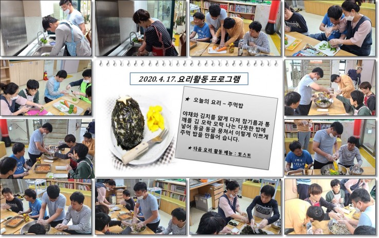 ➃ 오감 만족 요리활동 프로그램 페이지 정보 작성자 창인원 댓글 0건 조회 1,804회 작성일 20-04-21 16:24 목록 본문 3층 남자 이용인들이 간단하고 맛있는 주먹밥을 만들어 습니다. 이전글소독.. 20.04.23 다음글【4월 3주 이용인들의 학습프로그램 활동 사진- ➁ 20.04.21