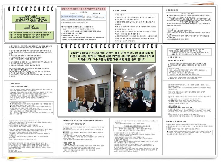 직원 회의 시작으로 거주장애인의 건강한 삶을 위한 〈 코로나19 대응 길잡이〉 교육을 진행하였습니다. 감염예방을 위해 창인홈 외.내부 소독을 더 철저히 하고 있고 원장님, 국장님 이하 직원모두 총력을 기울이고 있습니다.
