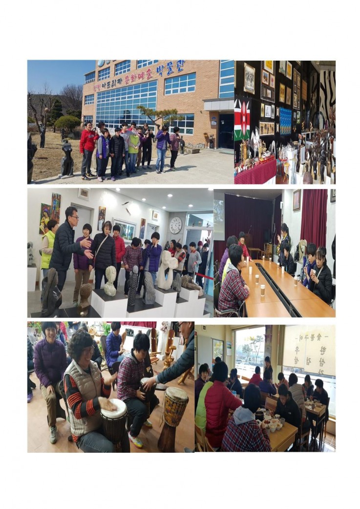 3월15일 용문면 금곡리에 있는 "아프리카문화예술 박물관"을 관람하였습니다. 여행중에 모은 아프리카 물품들이 모여 커다란 개인 박물관이 되었답니다.박물관 견학과 함께 커피나무 , 아프리카 공예품전시도관람하고 , 맛있는 식사를 하고 돌아왔습니다.